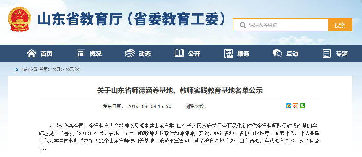 為貫徹落實(shí)全國(guó)、全省教育大會(huì)精神以及<中共山東省委 山東省人民政府關(guān)于全面深化新時(shí)代全省教師隊(duì)伍建設(shè)改革的實(shí)施意見(jiàn)>(魯發(fā){2018}44號(hào))要求,全面加強(qiáng)教師思想政治和師德師風(fēng)建設(shè),經(jīng)過(guò)各地、各校申報(bào)推薦、專家評(píng)選,評(píng)選曲阜師范大學(xué)中國(guó)教師博物館等21個(gè)山東省師德涵養(yǎng)基地,國(guó)家中印科技國(guó)際創(chuàng)新園等35個(gè)山東省教師實(shí)踐教育基地。