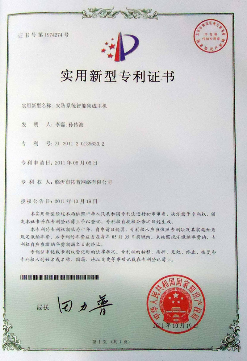 2011年10月19日,由我公司自主研發(fā)的安防系統(tǒng)智能集成主機獲得國家實用新型專利證書。該主機是一種新型的安防裝置,將周界報警、視頻丟失檢測報警、RFID停車場、閉路電視監(jiān)控、短信電話提示等實現(xiàn)信息的共享,融合為一個系統(tǒng)的安防系統(tǒng)智能集成主機,同時解決現(xiàn)在電腦自帶的單個物理串口無法滿足多個安防系統(tǒng)共存的問題。 近年來,公司的自主研發(fā)能力不斷增強,技術水平不斷突破,獲得一個又一個專利和各種資格認證,各種自主研發(fā)的產(chǎn)品已在國內(nèi)外多個省市推廣應用,并多次獲得國家、省、市級獎項,取得了良好的社會、經(jīng)濟效益。這次安防系統(tǒng)智能集成主機專利的獲得是對我公司技術水平和研發(fā)能力的又一次認可。 作為員工,我們?yōu)楣救〉玫某煽兏械津湴梁妥院溃镜陌l(fā)展壯大離不開每一位員工的辛勤工作和自我奉獻。在今后的工作中,我們要以更大的工作熱情、更高的工作效率,更強的敬業(yè)精神,用心工作,充分利用公司提供的這一平臺,開拓創(chuàng)新,奮發(fā)有為,實現(xiàn)公司的跨越式發(fā)展。