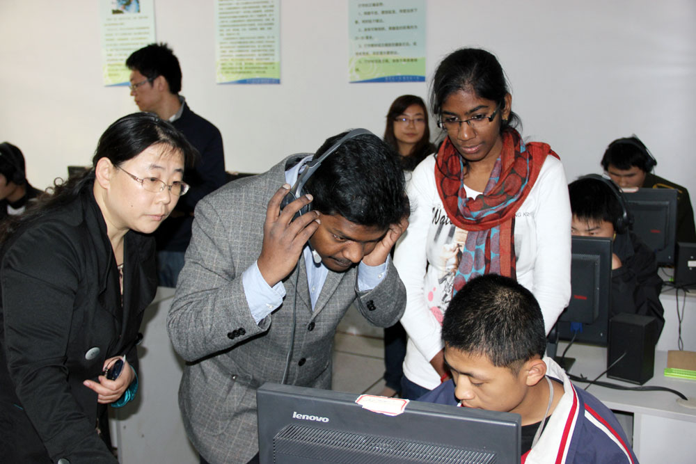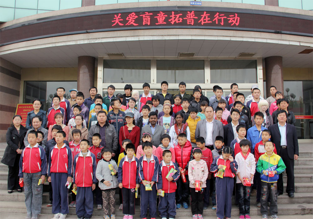 關(guān)愛盲童活動現(xiàn)場 印度籍軟件專家BABU(左二)與KAMALAM(左三)與同學(xué)們互動交流 臨沂市拓普網(wǎng)絡(luò)有限公司為孩子們捐贈的部分物資