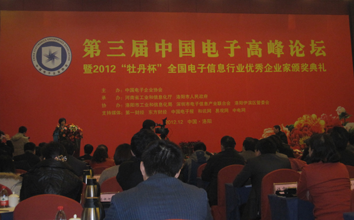 12月15日,由中國(guó)電子企業(yè)協(xié)會(huì)主辦的第三屆中國(guó)電子高峰論壇暨2012“牡丹杯”全國(guó)電子信息行業(yè)優(yōu)秀企業(yè)家頒獎(jiǎng)典禮在河南洛陽(yáng)舉行,公司總經(jīng)理王嵐保先生榮獲“全國(guó)電子信息行業(yè)優(yōu)秀企業(yè)家”稱號(hào)。該項(xiàng)榮譽(yù)是繼2011年榮獲全國(guó)電子信息行業(yè)最具潛力企業(yè)后,公司取得的又一殊榮。 |