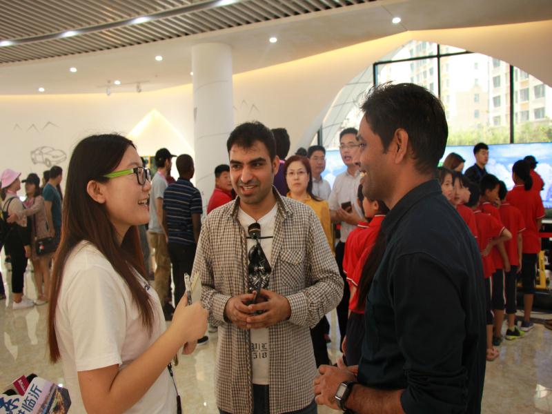 隨后,在中印專家隊伍的帶領(lǐng)下,留學(xué)生們來到了創(chuàng)客中心。無巧不成書,一支來自臨沂市的小學(xué)生隊伍正在創(chuàng)客中心內(nèi)進(jìn)行綜合實(shí)踐,兩支隊伍隨即展開了熱切的交流,并共同體驗創(chuàng)客中心內(nèi)的各個項目。整個上午,蓮花狀的山東智慧教育創(chuàng)客中心內(nèi),充滿了來自五湖四海不同膚色的小朋友和大朋友們的歡聲笑語。