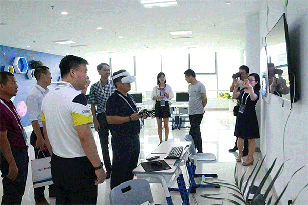 (體驗活動) 在園區(qū)智慧教育創(chuàng)客活動中心,企業(yè)家們在28間創(chuàng)客教室及蓮花型的創(chuàng)客活動中心內(nèi)親身體驗VR/AR設(shè)備、通過木工器械打磨手工、參觀藝達天香書畫院、古琴工坊,并深入了解智能機器人、機器魚等先進設(shè)備的運轉(zhuǎn)情況,整個參觀過程收獲滿滿,不亦樂乎。