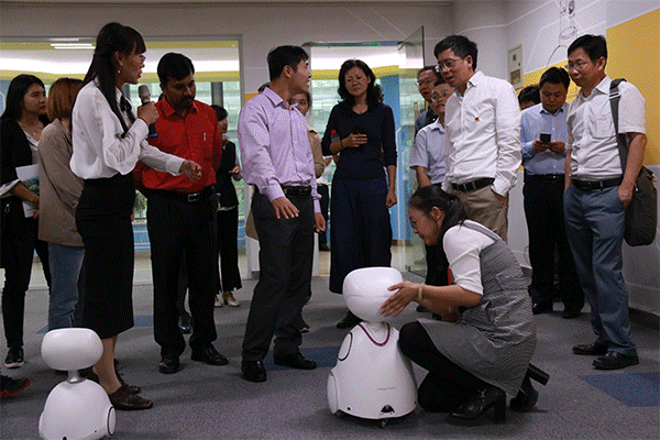 陳司長一行在公司相關人員的陪同下參觀了園區(qū)展廳、國際研發(fā)中心、山東智慧教育創(chuàng)客活動中心等地,并聽取了公司主營業(yè)務“拓普智慧教育云平臺”、“和博士學業(yè)測評”的詳細匯報,并與園區(qū)的印度專家展開了親切交流,詳細了解了外籍專家在公司的工作生活情況。在山東智慧教育創(chuàng)客活動中心,陳司長與園區(qū)智能機器人展開互動,詳細了解了智能機器人的各項功能,并親自體驗了園區(qū)引進的VR自行車、航空模擬器等先進設備。