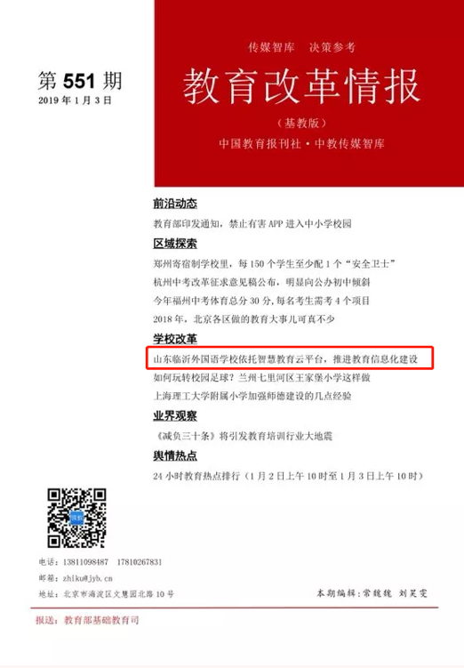 近日,教育部主管的國(guó)家級(jí)內(nèi)參《教育改革情報(bào)》以《依托智慧教育云平臺(tái),推進(jìn)學(xué)校教育信息化建設(shè)》為題原文刊發(fā)教育科學(xué)專欄,對(duì)臨沂外國(guó)語(yǔ)學(xué)校依托智慧教育云平臺(tái)、推進(jìn)學(xué)校教育信息化建設(shè)的經(jīng)驗(yàn)及做法進(jìn)行了宣傳報(bào)道。