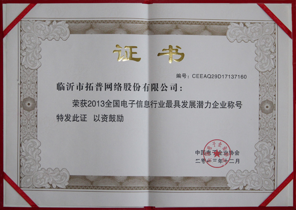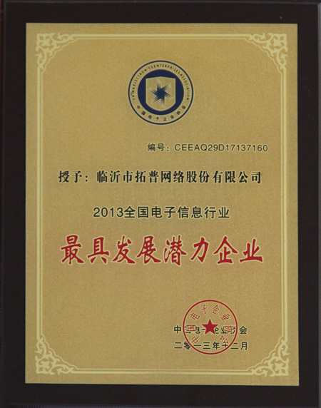 在中國(guó)電子企業(yè)協(xié)會(huì)主辦的“2013全國(guó)電子信息行業(yè)優(yōu)秀企業(yè)”評(píng)選中,公司從數(shù)百家企業(yè)脫穎而出,再度榮獲“全國(guó)電子信息行業(yè)最具發(fā)展?jié)摿ζ髽I(yè)”,這是繼2011年首屆評(píng)選活動(dòng)以來(lái),公司再度捧杯。