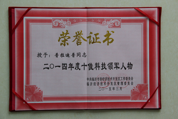 2015年3月9日,臨沂經(jīng)濟(jì)技術(shù)開發(fā)區(qū)領(lǐng)導(dǎo)干部大會隆重召開,市人大常委會副主任、開發(fā)區(qū)黨工委書記徐福田出席會議并作重要講話,大會表彰了2014年創(chuàng)業(yè)功臣、功勛企業(yè)、科技創(chuàng)新先進(jìn)單位等先進(jìn)個(gè)人、先進(jìn)集體,其中,公司印度專家普拉迪普榮獲“十佳科技領(lǐng)軍人物”。
