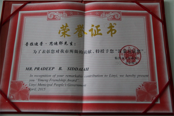 2015年4月29日,全市引進國外智力工作會議暨第六屆“沂蒙友誼獎”頒獎儀式隆重舉行,公司印度專家普拉迪普博士獲此殊榮。 公司正因為擁有這樣的人才技術(shù)團隊無私奉獻,才在發(fā)展中不斷的壯大。未來,公司將繼續(xù)引進國內(nèi)外優(yōu)秀技術(shù)人才、行業(yè)專家,不斷增進中印兩國的人才、技術(shù)交流與合作,為臨沂市信息產(chǎn)業(yè)的發(fā)展做出更大的貢獻。 ![]() 普拉迪普上臺領(lǐng)獎 獲獎證書