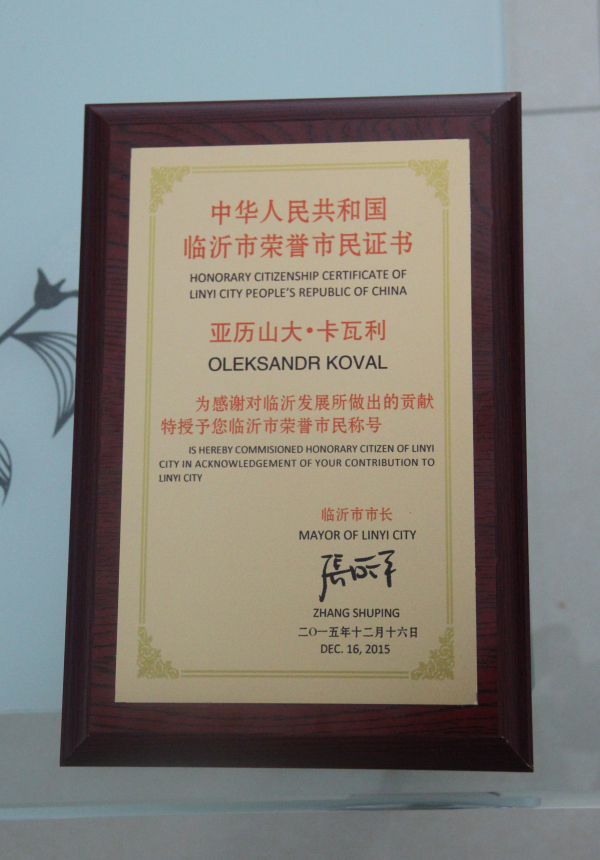 祝賀公司烏克蘭亞歷山大·卡瓦利博士榮獲“臨沂市榮譽(yù)市民”稱號(hào) |