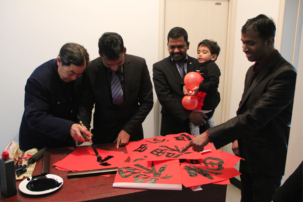 拓普書畫院孫太東老師教給印度專家寫春聯(lián) 俗話說:“好吃不過餃子。”餃子也是中國人過年必吃的,他們來印度,沒有過過真正意義上中國的春節(jié),所以把他們邀請來,一塊過年,教他們包餃子、寫春聯(lián)、貼春聯(lián),過一個紅紅火火的中國年。