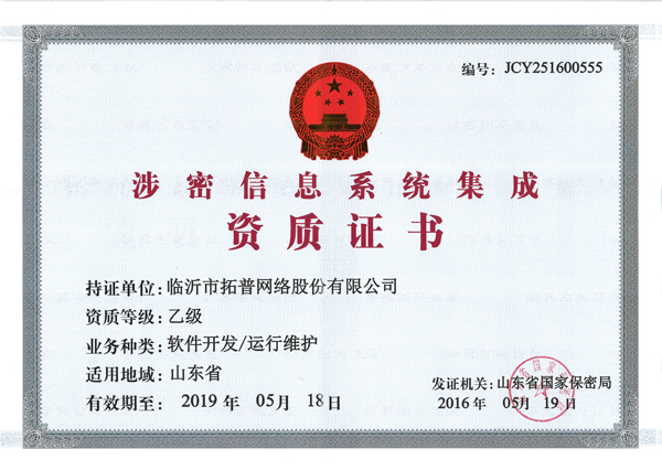 | 熱烈祝賀公司榮獲“涉密信息系統(tǒng)集成資質(zhì)證書” |